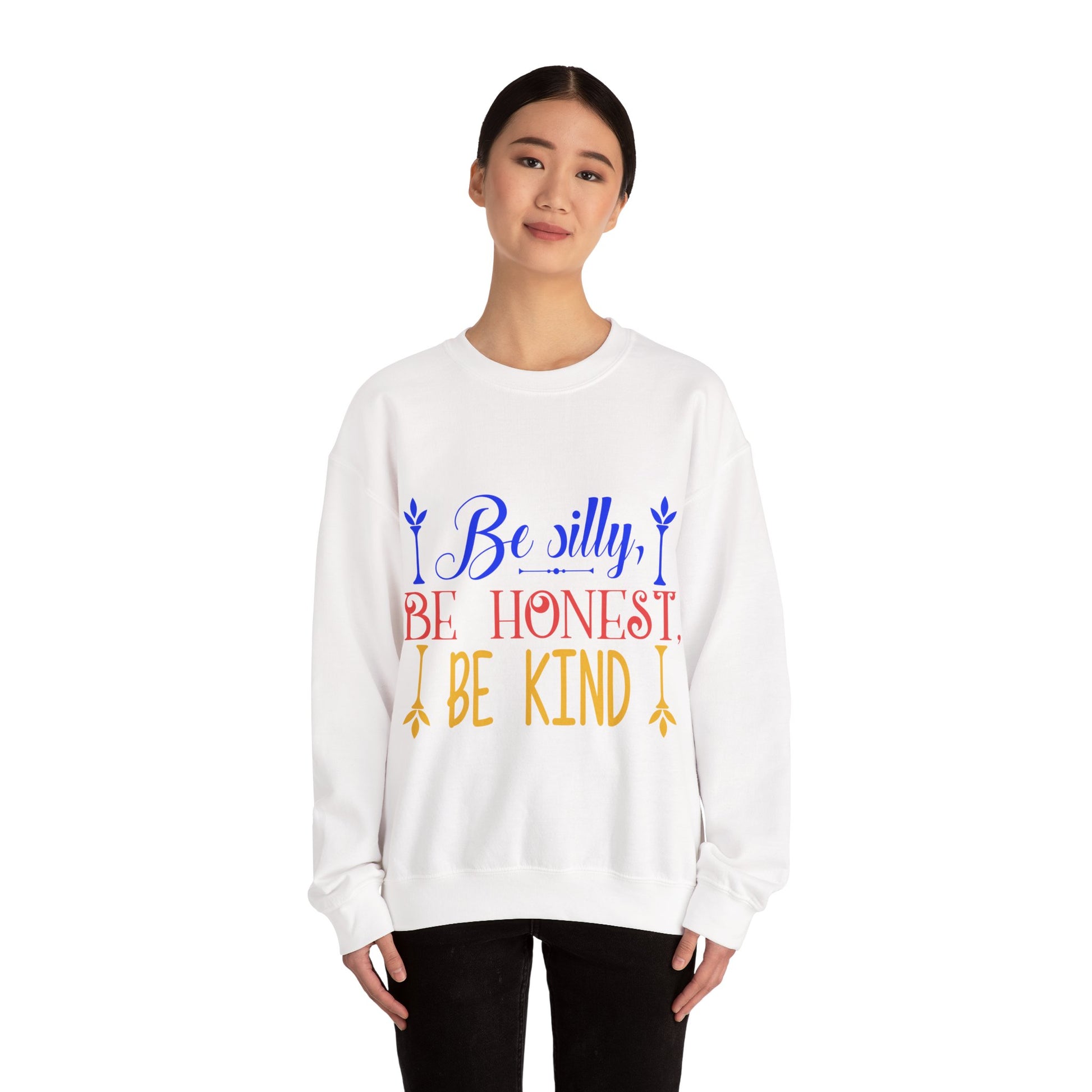 This unisex crewneck sweatshirt is the perfect combination of comfort and style. The uplifting message, 'Be silly, Be honest, Be kind,' creates a warm and inviting vibe, making it an ideal addition to your cozy wardrobe. Whether you're lounging at home, enjoying a casual outing, or running errands, this sweatshirt fits effortlessly into your daily life. It's perfect for those who value positivity and self-expression, making it a thoughtful gift for friends and family. Great for all occasions, from birthdays to holidays, or as a special treat to celebrate moments of joy and connection.